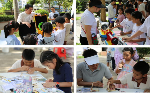 随后,在志愿者的引导下,大家移步小广场开启声学探秘之旅,共同体验操作了龙洗盆、共振鼓、雪浪声波、无皮鼓、指向性扬声器、克拉尼图形器等声学产品,将抽象的声学原理化作可触可感的奇妙现象,并以家庭为单位共同完成声学模型创作,在动手的过程中将收获的声学知识付诸实践,并收获快乐。最后,当大家的声纹玫瑰在小程序里绽放出独一无二的频谱图案时,这场科普活动画上了完美句点。